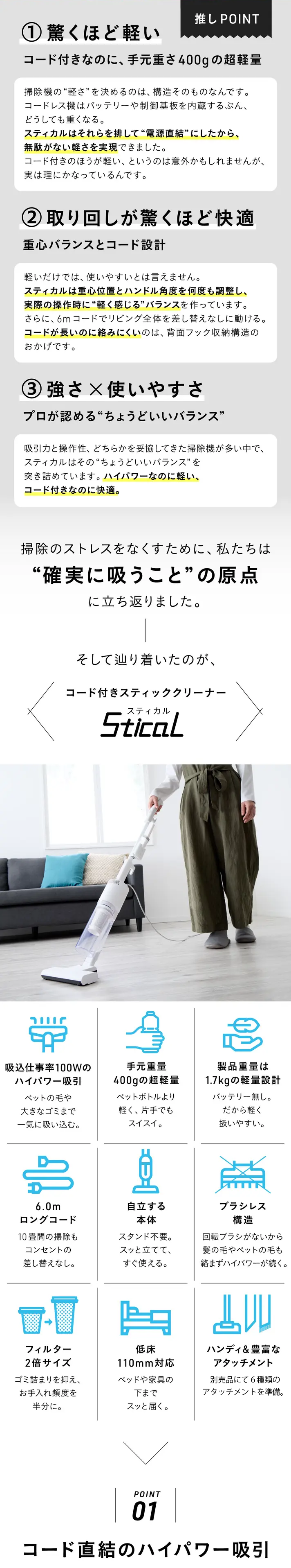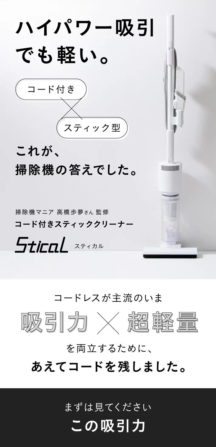 スティカルは掃除機の重心設計にこだわり、手にかかる重さをわずか400gに抑えました。