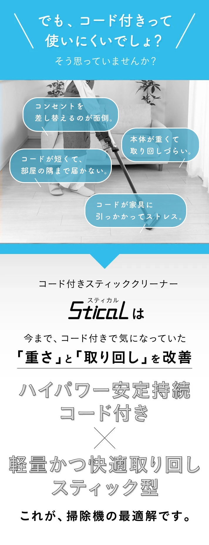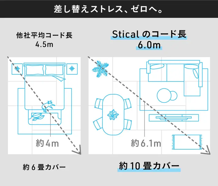 平均的なコード長(約4.5m)では届かなかった部屋の隅や家具の裏も、スティカルならスッと届きます。