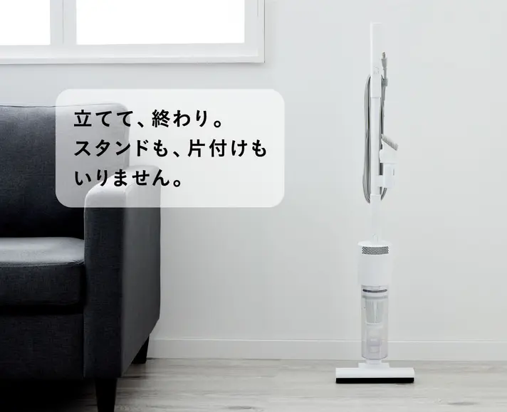 多くのスティック掃除機のようにスタンドを組み立てたり、壁に立て掛けたりする必要がありません。