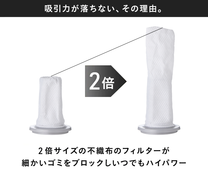 ホコリやペットの毛が溜まっても風の通り道を確保し、長時間でも安定した吸引力を維持します。