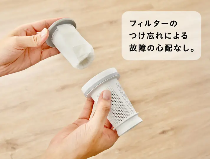 フィルターを正しく装着しないと動作しない「つけ忘れ防止機構」を搭載。